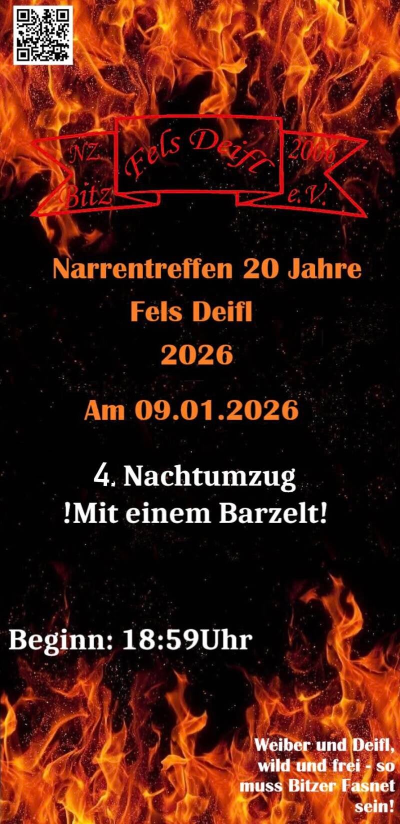 Die Fels Deifl Bitz feiern vom 9. bis 11. Januar 2026 ihr 20-jähriges Bestehen und laden anlässlich dieses Jubiläums zu einem dreitägigen Narrentreffen ein. Besucherinnen und Besucher erwartet ein abwechslungsreiches Programm mit traditionellen Umzügen, Brauchtum und Festbetrieb.